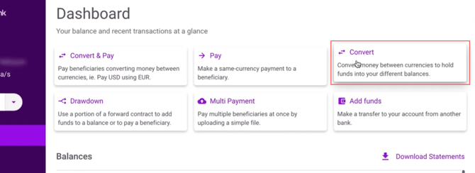 If you want to make a currency exchange without allocating a payment, you can select the Convert option on the platform.